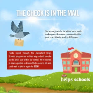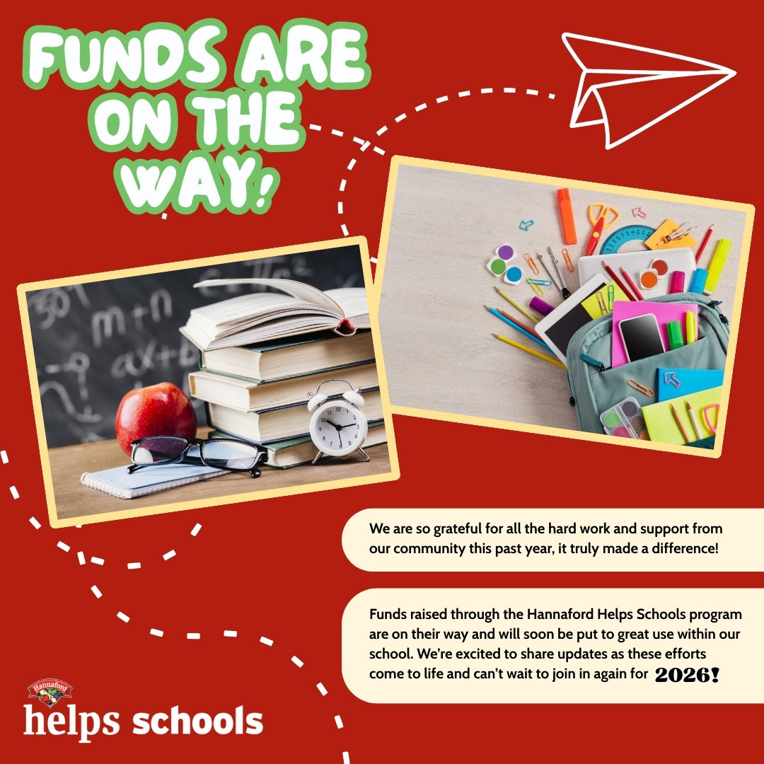Suggested post caption: We’re excited to share that funds from the 2025 Hannaford Helps Schools program are on the way, and we are so grateful for the incredible community support that made it possible! These dollars will go right back into supporting our school community, helping to [insert specific ways funds will be used]. Together, we’ve built amazing momentum, and we can’t wait to make 2026 even more impactful!