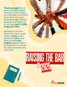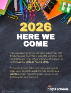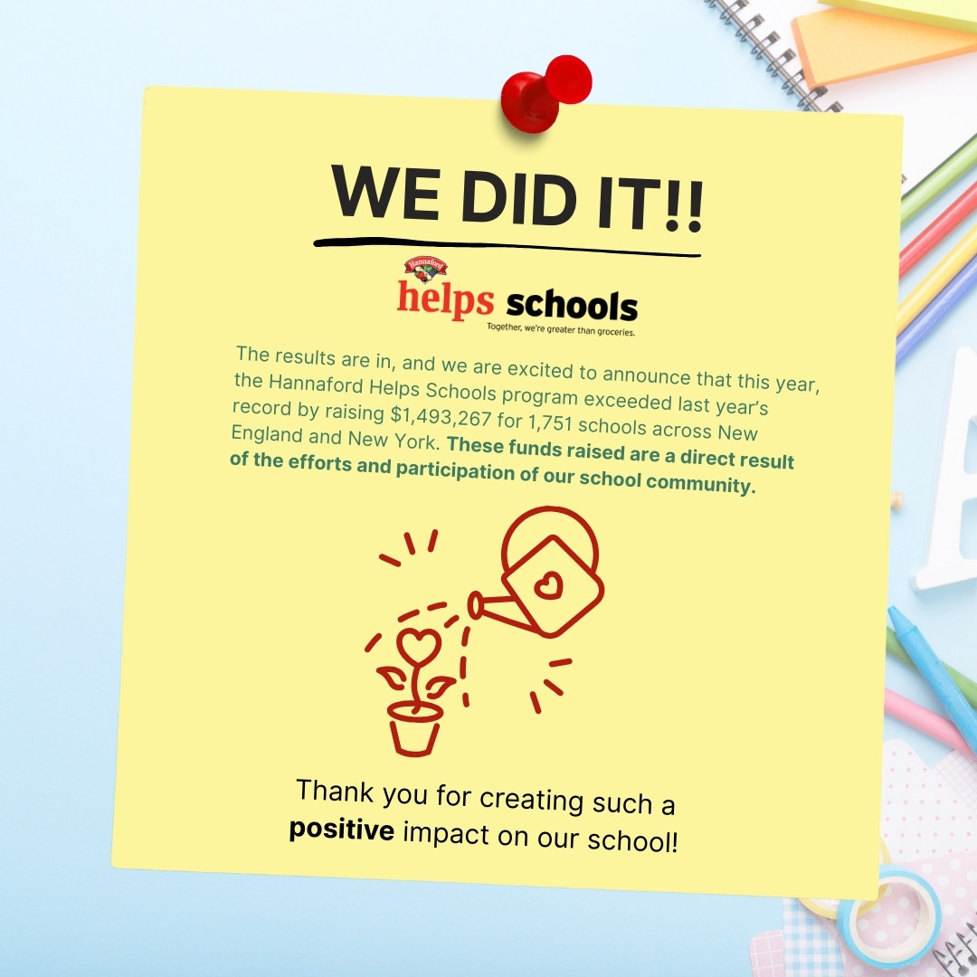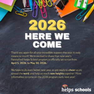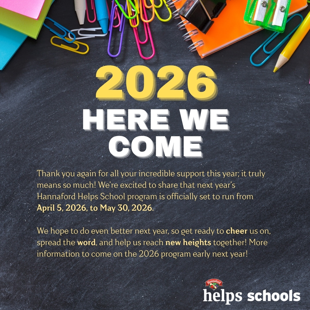 Suggested post caption: Thank you again for your incredible support! The 2026 Hannaford Helps Schools program will bring 8 weeks of opportunity for [insert school name] and our local community, running from April 5 through May 30, 2026. We’re excited to see what we can achieve together and are hopeful it will be our best year yet. Keep an eye out for more information as we get closer and get ready to bring your energy to the next campaign!